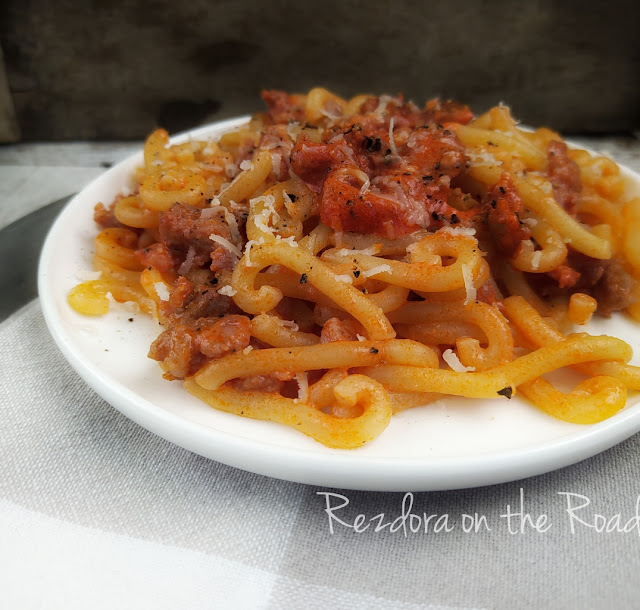Tiziana e’ una cuoca brava,molto brava,ha la ristorazione nel sangue, tutti in famiglia spignattano hanno sempre avuto ristoranti e ..insomma Ciruzzo tutte le volte che passavamo dalla sua rosticceria comprava una porzione di gramigna con la salsiccia perche’ era la meglio GRRRR!! Cosi’ dopo un tot di anni ho chiesto a Tiziana come la faceva:”ma nieente..un soffrittino di cipolla rosoli la salsiccia,metti il pomodoro..bon..fatta”. E invece no! ho girato, dosato ,saltato questi ingredienti milione di volte non mi riusciva mai..era ormai una questione di principio,ero infatti arrivata al classico “machissenefrega”poi un giorno…eccola!